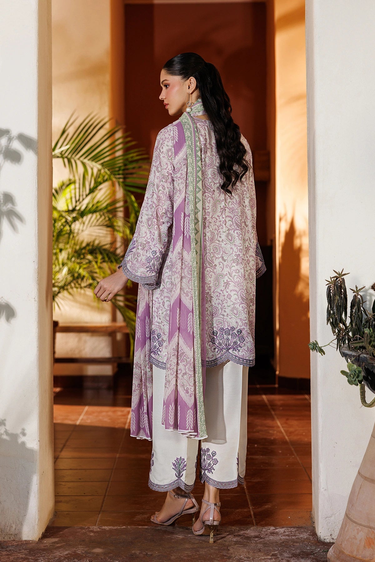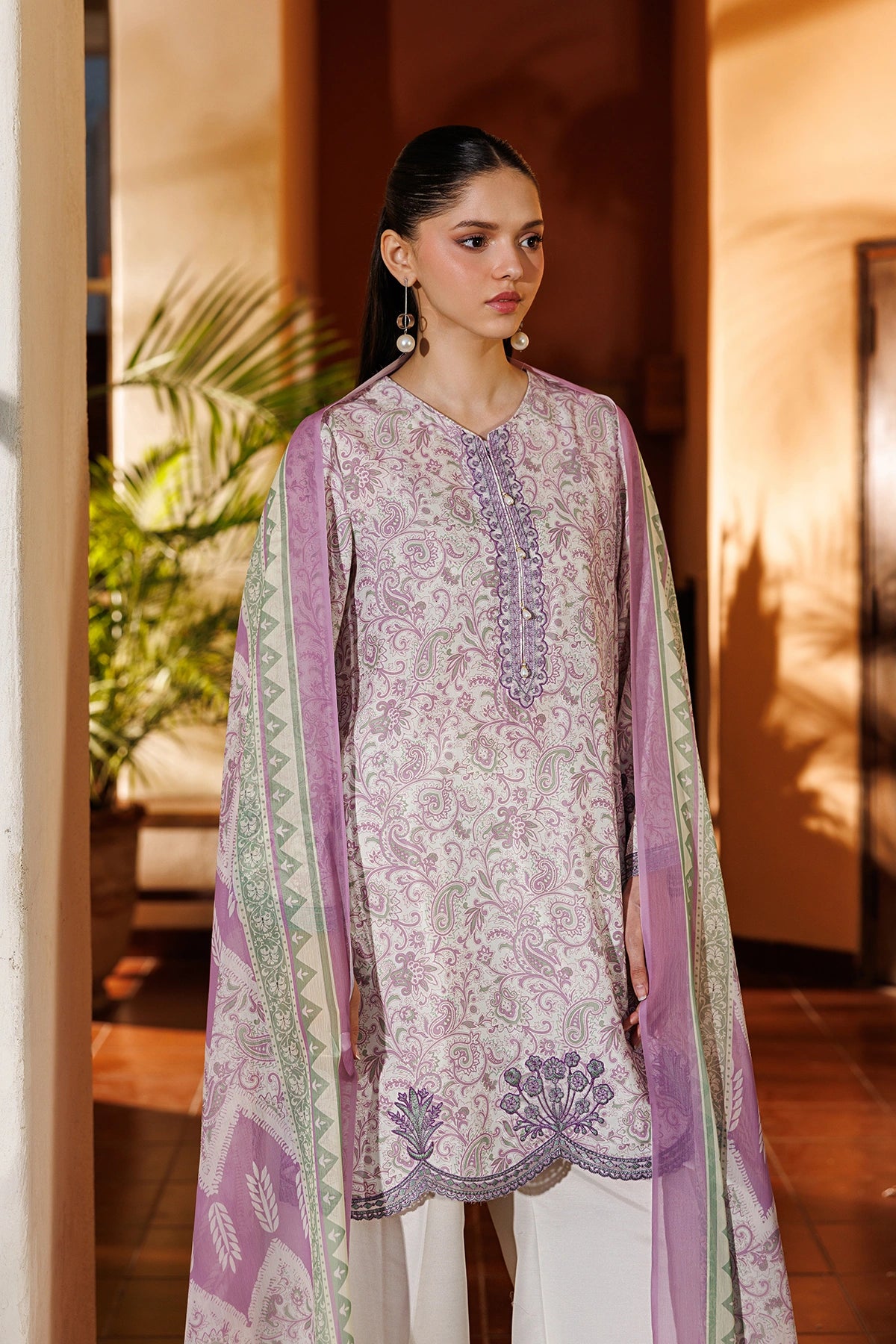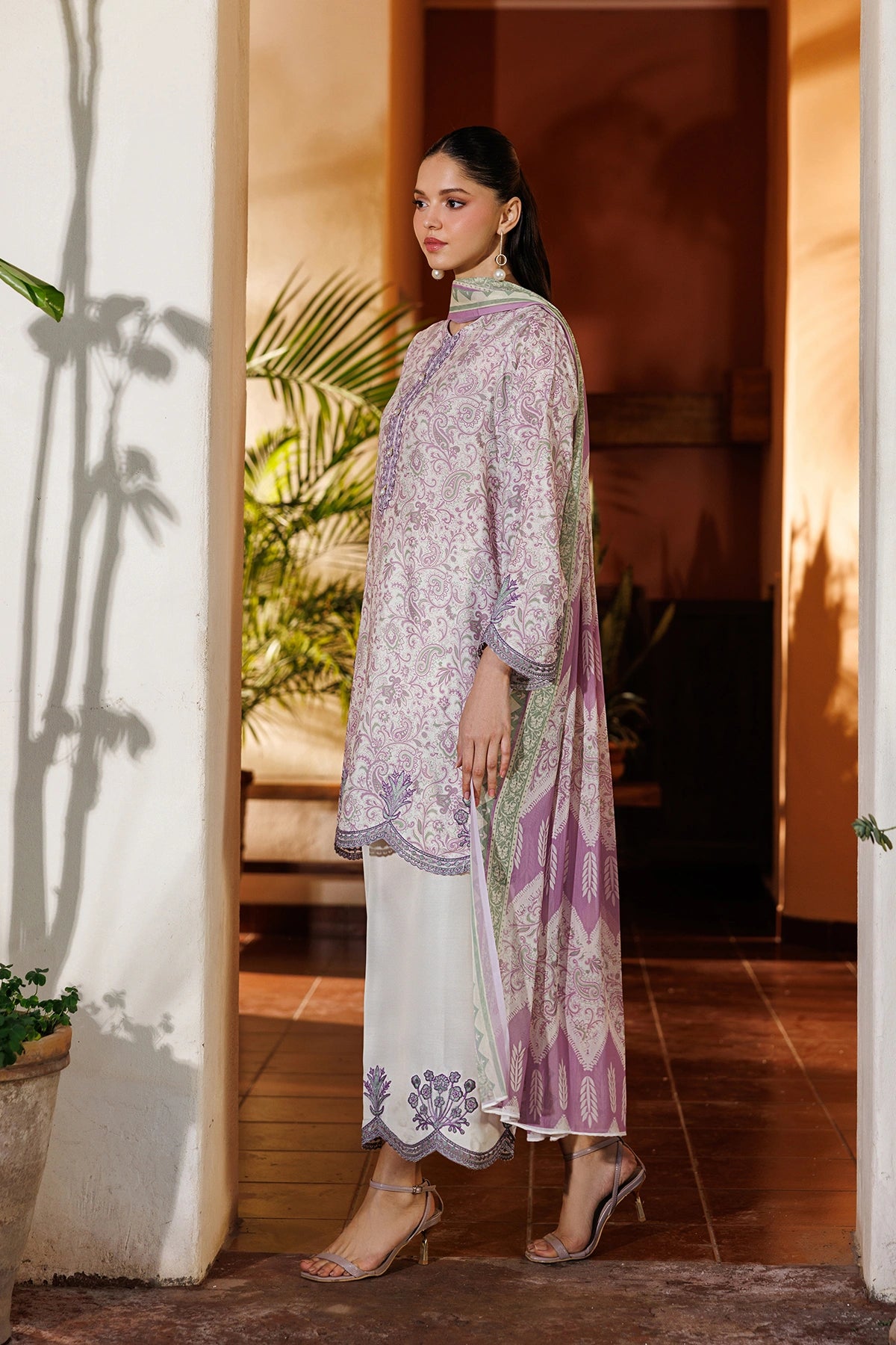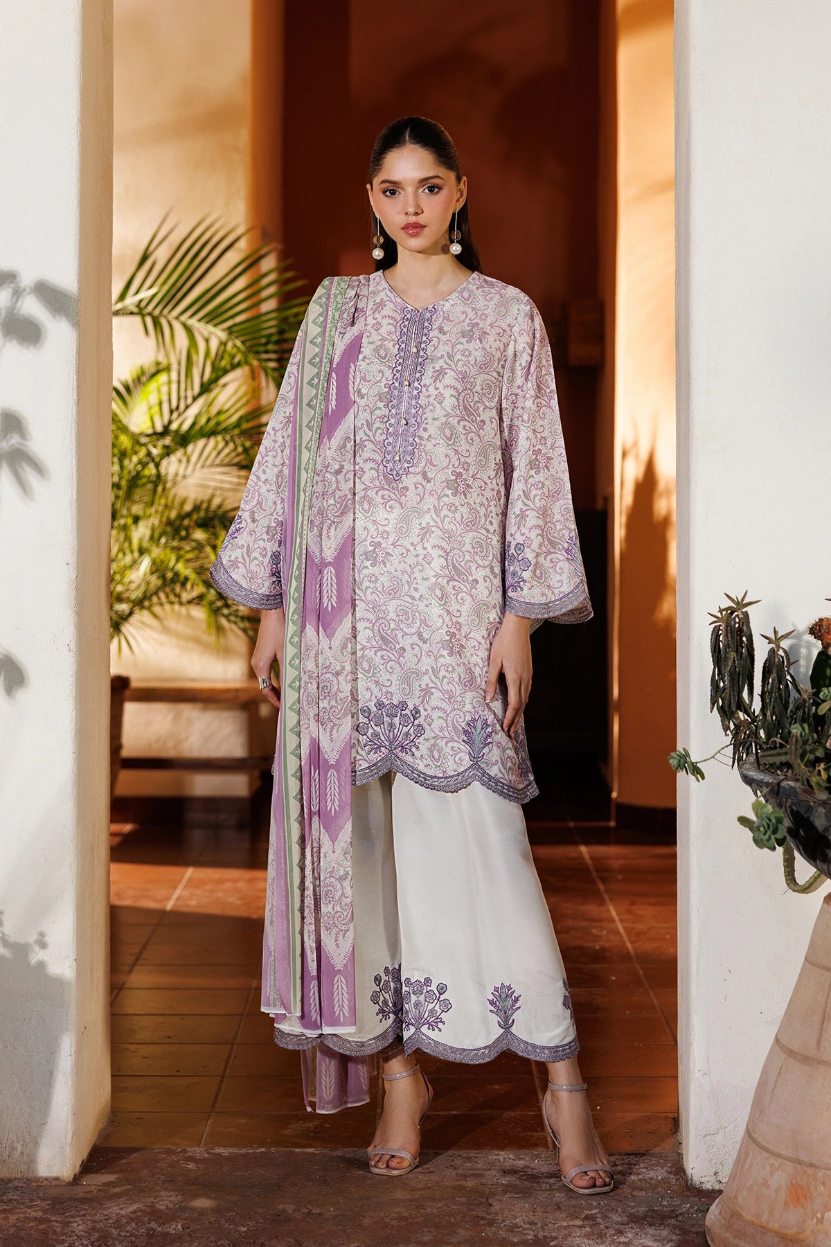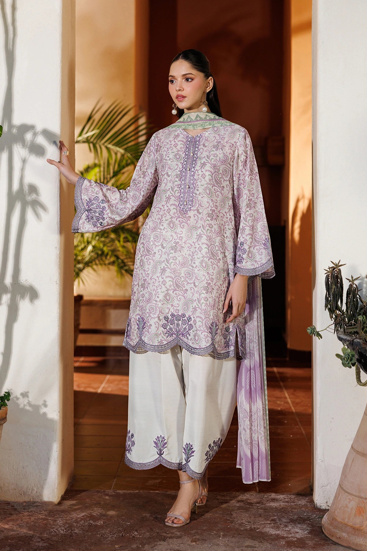 Elegant outfit featuring a printed front and printed sleeves, beautifully enhanced with an embroidered organza patch for sleeves and daman and a delicate embroidered organza neckline. Finished with a printed back, a graceful printed chiffon dupatta, and a plain dyed trouser for a complete, stylish look
